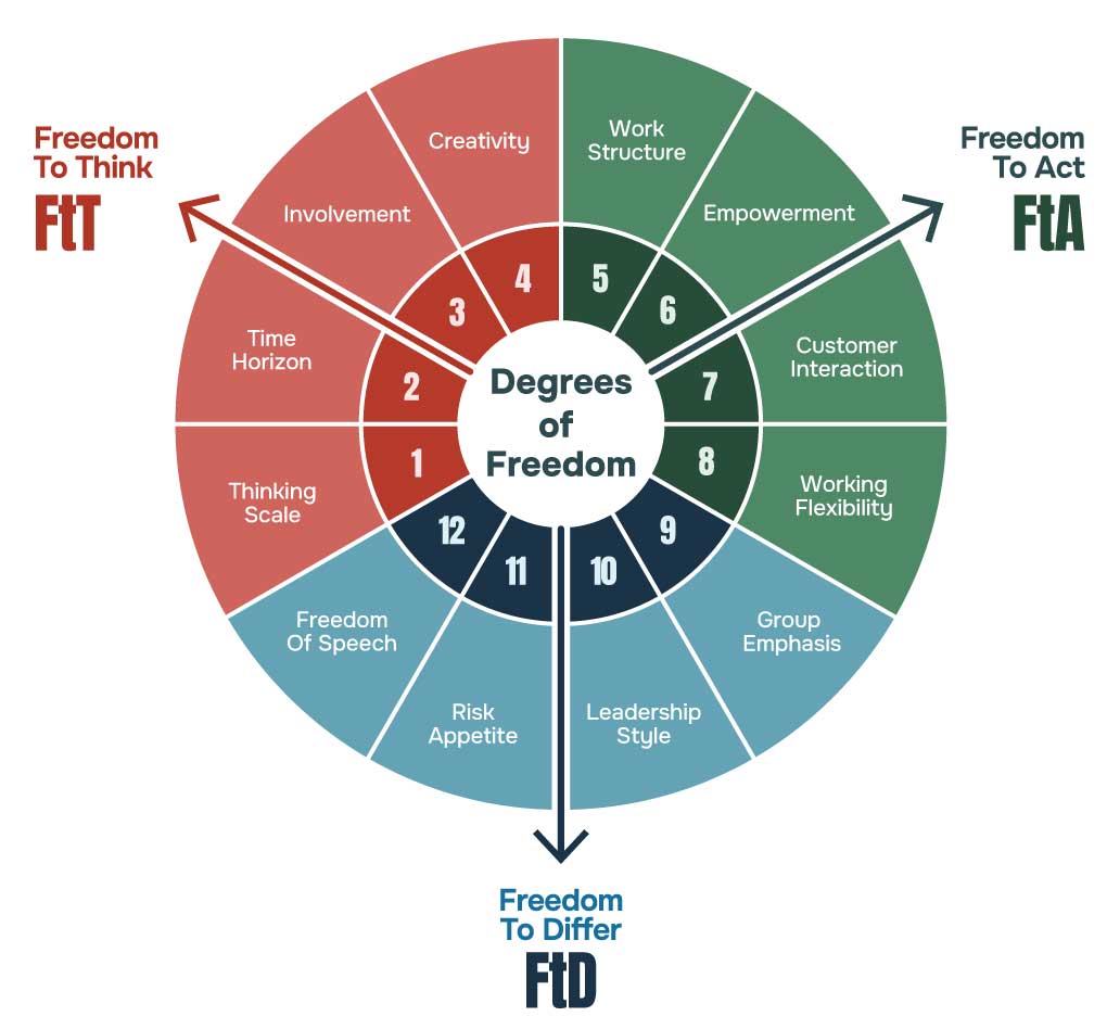 The Org Culture Framework is illustrated by the graphic below. It is comprised of 12 org culture dimensions grouped into three areas – “Freedom to Think” (FtT), “Freedom to Act” (FtA), and “Freedom to Differ” (FtD).